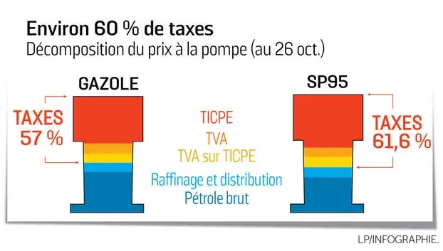 Ces 60% de taxes sont composés de nombreuses taxes: la TVA classique, TICPE (qui contient la fameuse taxe carbone), la TVA sur le TICPE (donc taxer des taxes). Ce graphique de Le Parisien démontre bien l’ampleur de tous ces prélèvements.